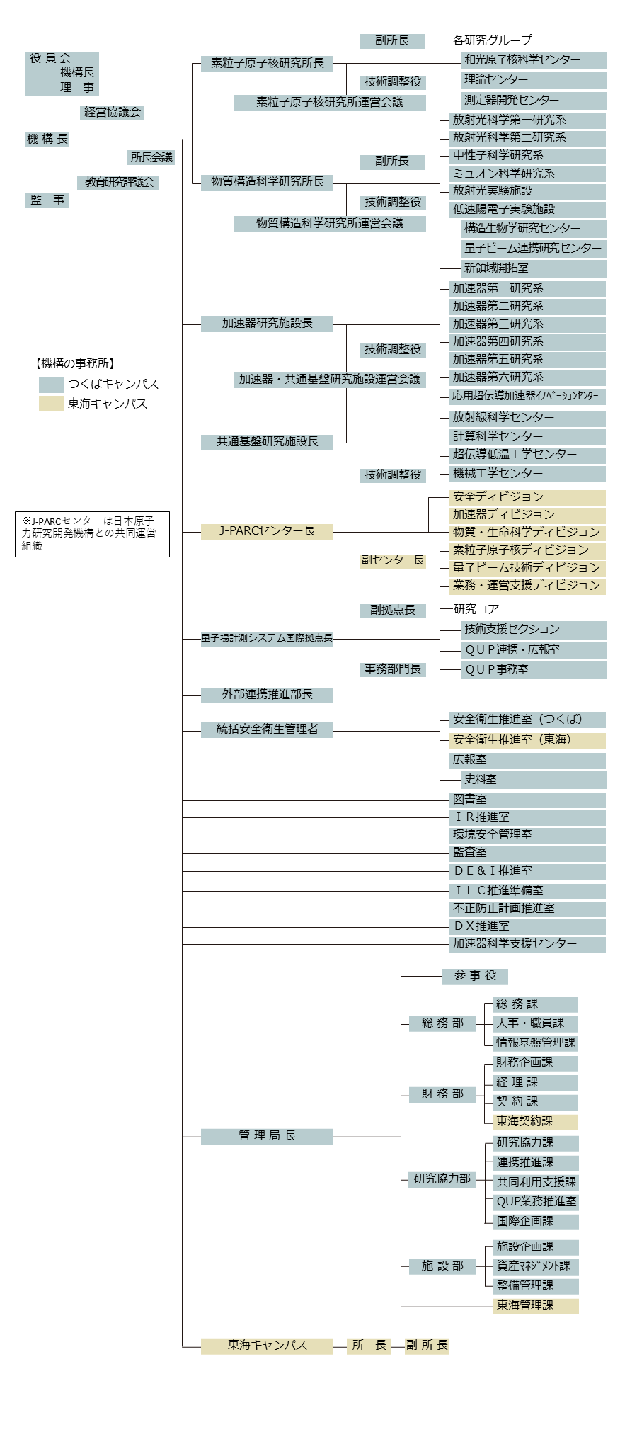 機構に、直属施設として加速器研究施設及び共通基盤研究施設を置き、素粒子原子核研究所及び物質構造科学研究所と一体的に運営しています。