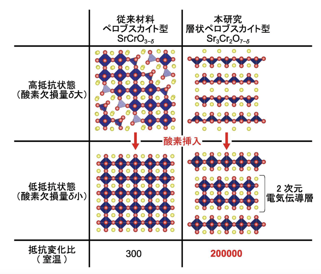 遷移金属酸化物には結晶構造や化学組成の違いによって性質が大きく変わる材料が多く存在します。なかでも、酸素の出入り(脱挿入)によって電気抵抗率が大きく変化する材料は、次世代メモリーや高感度センサーなどへの応用が期待されています。