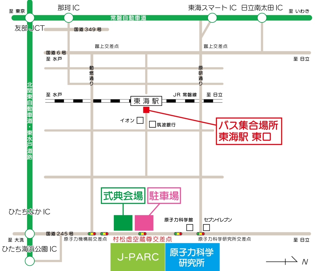 東京方面から電車でお越しの方は、8:30上野発(JR特急ときわ53号)→9:55勝田着、(乗り換え)10:11勝田発(JR常磐線)→10:19東海着をご利用の場合、東海駅東口10:25発にて会場まで送迎バスをご用意する予定です。お車でお越しの際は、式典会場付近に駐車場(無料)がございます。