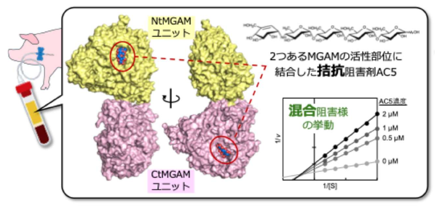 MGAMは哺乳類の小腸に存在する澱粉消化酵素の一つです。MGAMの阻害は、食後血糖値の急激な上昇(血糖値スパイク)を抑制し、2型糖尿病の予防や治療に有効です。しかし、MGAMを小腸から大量に取得することは難しく、MGAMと阻害剤との相互作用の詳細は明らかにされてきませんでした。本研究ではMGAMがブタの血清中に大量に存在することを発見し、高純度のMGAMを高収量で取得する方法を確立しました。さらにAC5により阻害されたMGAMの立体構造をKEKのクライオ電子顕微鏡を用いて解明、阻害の速度論的解析を行い、AC5によるMGAMの阻害で観察される混合阻害に似た挙動が、二重の拮抗阻害に起因することを明らかにしました。本研究の成果は、食後の血糖値スパイクを抑制する医薬品や食品の研究開発の加速につながることが期待されます。 なお、本研究成果は、2026年1月14日(水)公開のJournal of Enzyme Inhibition and Medicinal Chemistry誌にオンライン掲載されました。