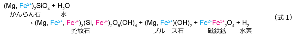 海洋底のマントルや下部地殻に含まれるかんらん石と水の反応、すなわち蛇紋岩化反応は、自然界における水素生成の主要なメカニズムとして知られています(図1)。この反応によって生まれる水素は、地下深部に生きる微生物のエネルギー源となるだけでなく、人類が利用可能な新たなエネルギー資源としても関心が高まっています。この反応では、岩石中の2価の鉄が3価の鉄へと酸化されると同時に水が還元され、その結果として水素が生成されます(式1)。しかし、水素発生の鍵を握る鉄の分布や化学状態が、反応の進行にともなってどのように変化するのかこれまで十分に分かっておらず、天然水素の生成プロセスの理解を難しくしていました。