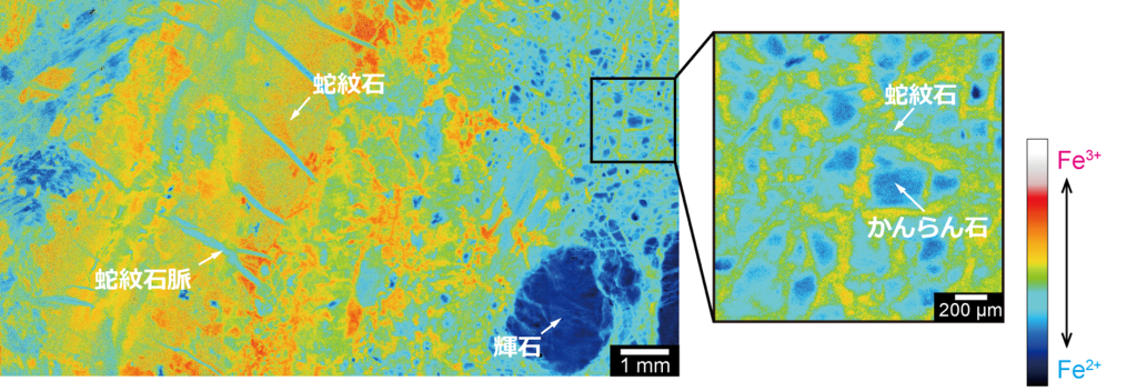 図2. 鉄の化学状態を可視化した結果。かんらん石や輝石といった水と反応する前の鉱物は2価の鉄(Fe2+)が多い一方で、生成鉱物である蛇紋石には3価の鉄(Fe3+)が多く含まれることが分かる。これらの観察結果は、鉄が水を還元して水素が発生したことを示している。