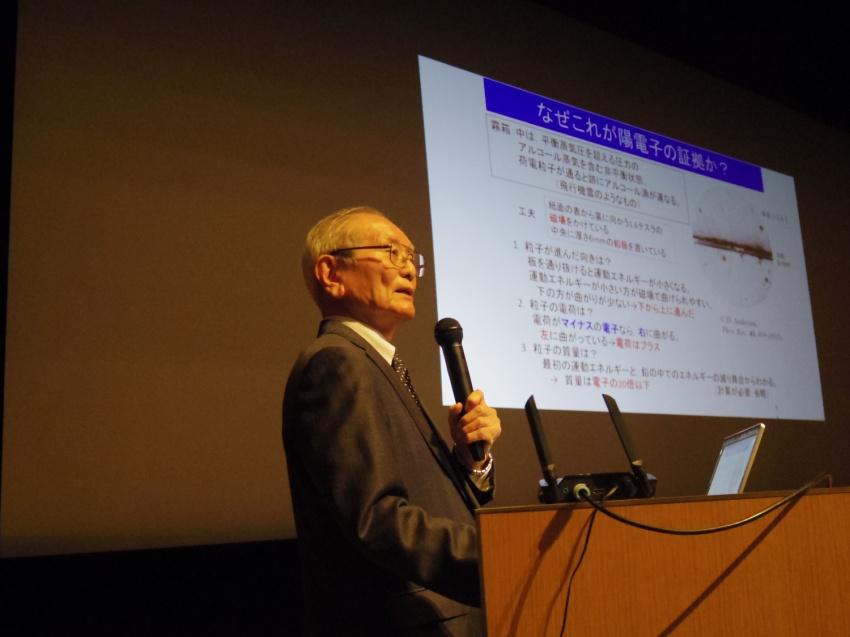 イベントの第一部では、東京大学名誉教授の兵頭 俊夫(ひょうどう としお)さんによる講演が行われました。「陽電子 -最も身近な反粒子- その多彩な活躍」と題し、陽電子の基本的な性質やさまざまな使い方まで広く解説しました。普段耳にすることの少ない陽電子というテーマでしたが、医療分野から素粒子や原子の基礎理論の検証まで、その多彩な利用法に来場者は興味深く耳を傾けていました。講演後の質疑応答では、多くの質問が寄せられ、参加者の関心の高さが感じられる時間となりました。