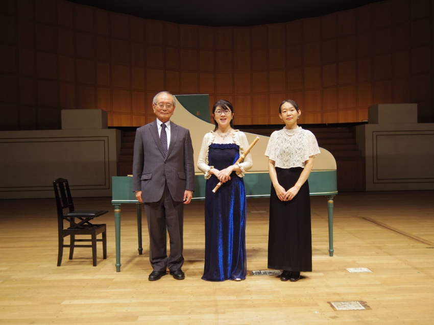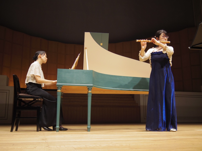 第二部では、フラウト・トラヴェルソ奏者の新井 道代(あらい みちよ)さん、チェンバロ奏者の福間 彩(ふくま あや)さんによるコンサートが行われました。「フラウト・トラヴェルソの魅力」というテーマで、オトテールの「フルートと通奏低音のための組曲 ト長調」、ブラヴェの「フルートと通奏低音のためのソナタ ホ短調」、テレマンの「<6つの序曲集>より序曲 イ長調」、バッハの「フルートとチェンバロのためのソナタ ロ短調」などを演奏し、古楽器ならではの美しい音色と深い表現力で来場者を魅了しました。