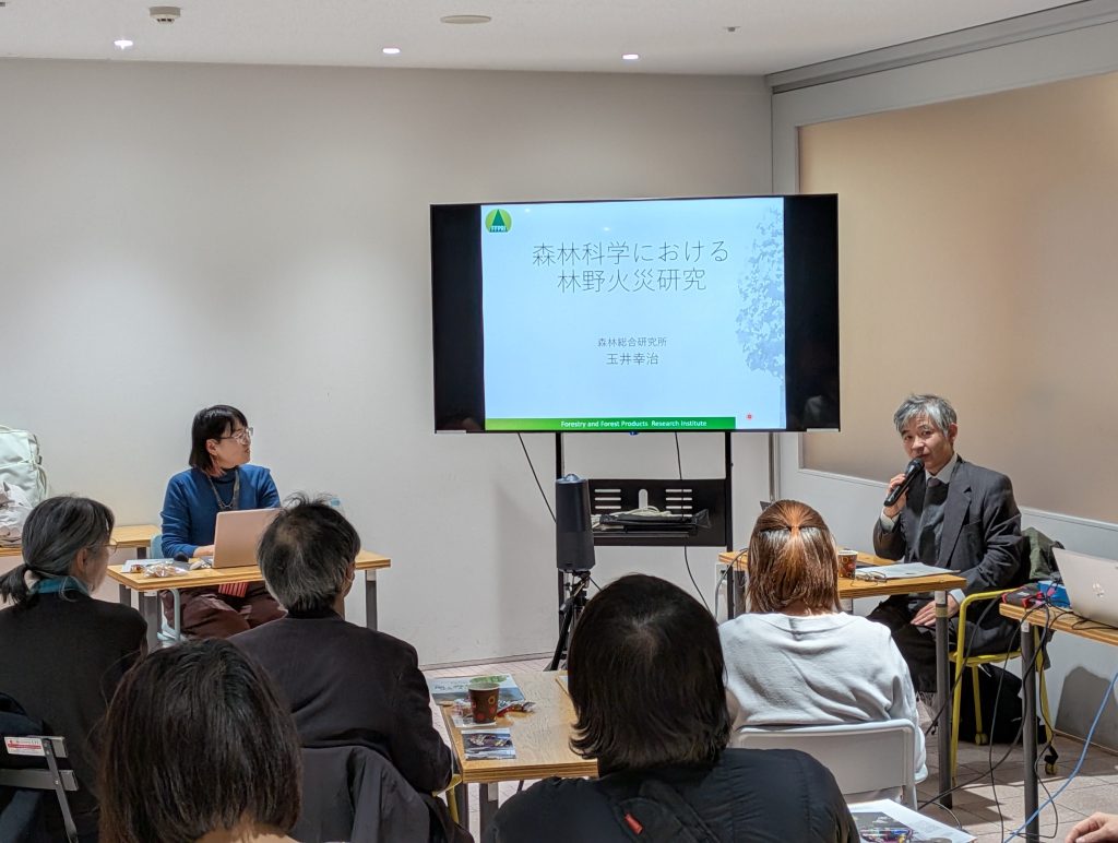 2/18(水)は日本における林野火災研究について森林総合研究所 森林防災研究領域 玉井 幸治主任研究員が日本の林野火災の特徴や原因について、実際の事例を挙げながら説明しました。KEK広報室・つくば科学教育マイスターの青木優美がファシリテーターを務め、スライド中の専門用語や数式について適宜登壇者に質問し、内容がより理解しやすくなるよう進行しました。会場は49人の参加者で満員となり、参加者は真剣な面持ちで聞いていました。