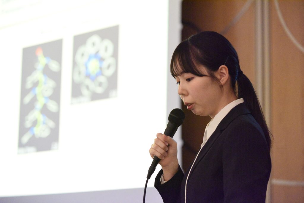 学生(大学院生)としてプレゼンテーションに立った筑波大学の大学院(応用理工学)で研究する興梠紗英(こうろき さえ)さんは、配属先である後藤博正准教授の研究室を代表して登壇しました。