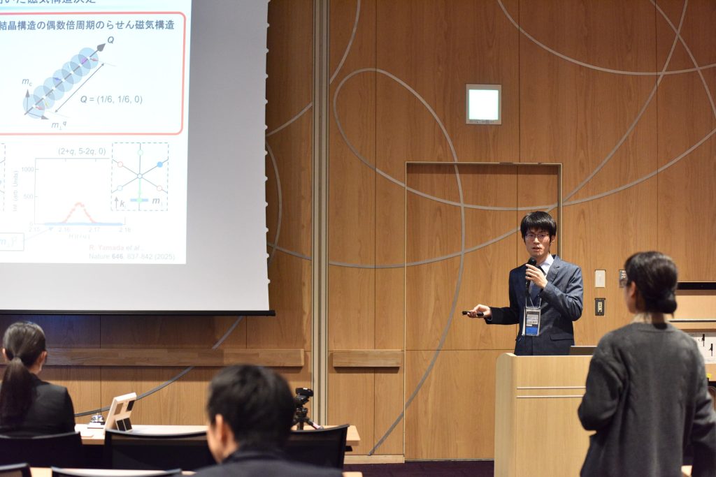 「フォトンファクトリー(PF)のBL-3A(極限条件下精密単結晶X線回折ステーション)を利用しています」と言う東京大学の山田林介助教は量子磁性材料を作ることを専門とする研究室に所属して、物質合成と輸送測定を通じて、物質固有の特性がなぜ現れるのか、その起源を調べています。フェスタでは、世界が注目するスピントロニクス材料や量子デバイスの応用研究への貢献が見込まれる新規反強磁性体の研究について発表をしました。